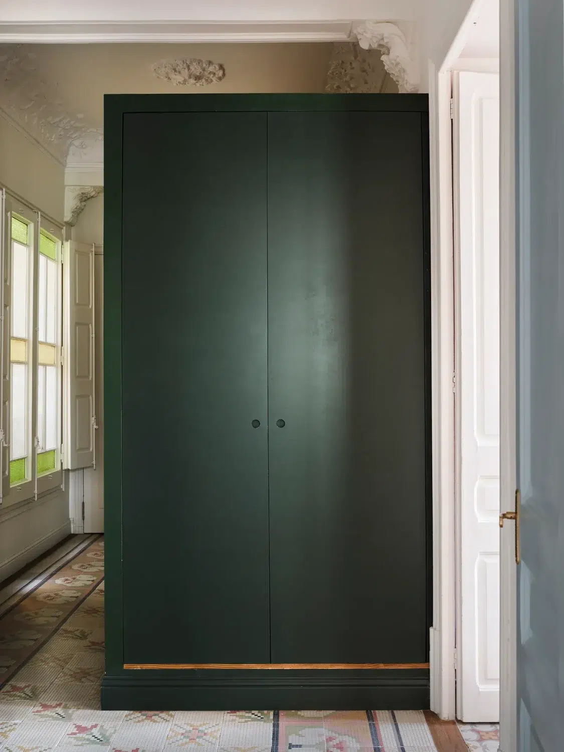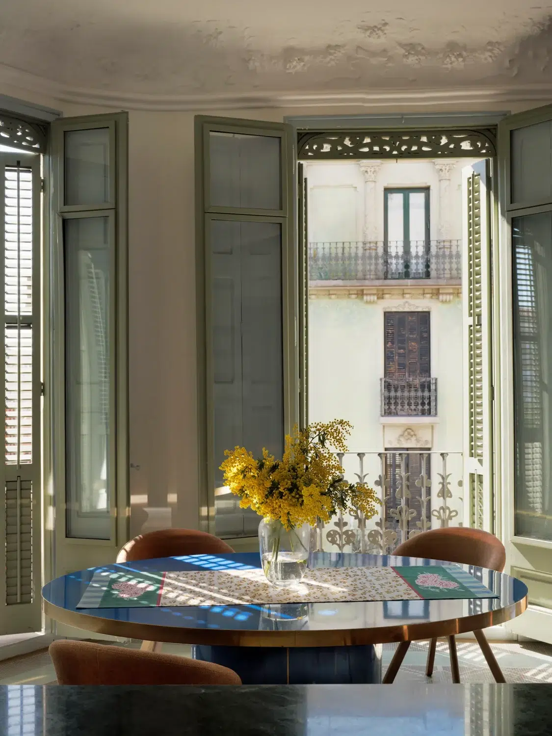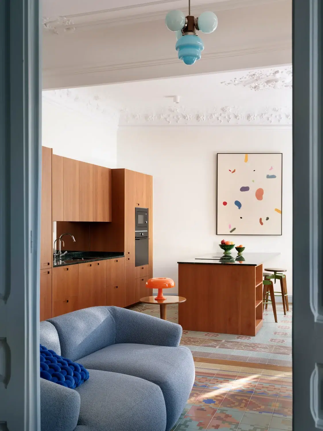 Set in the heart of the Eixample, the apartment belongs to the kind of building that already comes with good bones—think hydraulic tile floors, ornate ceiling moldings, tall windows, and original woodwork. The kind of details designers usually dream about (and pray they’re still intact).