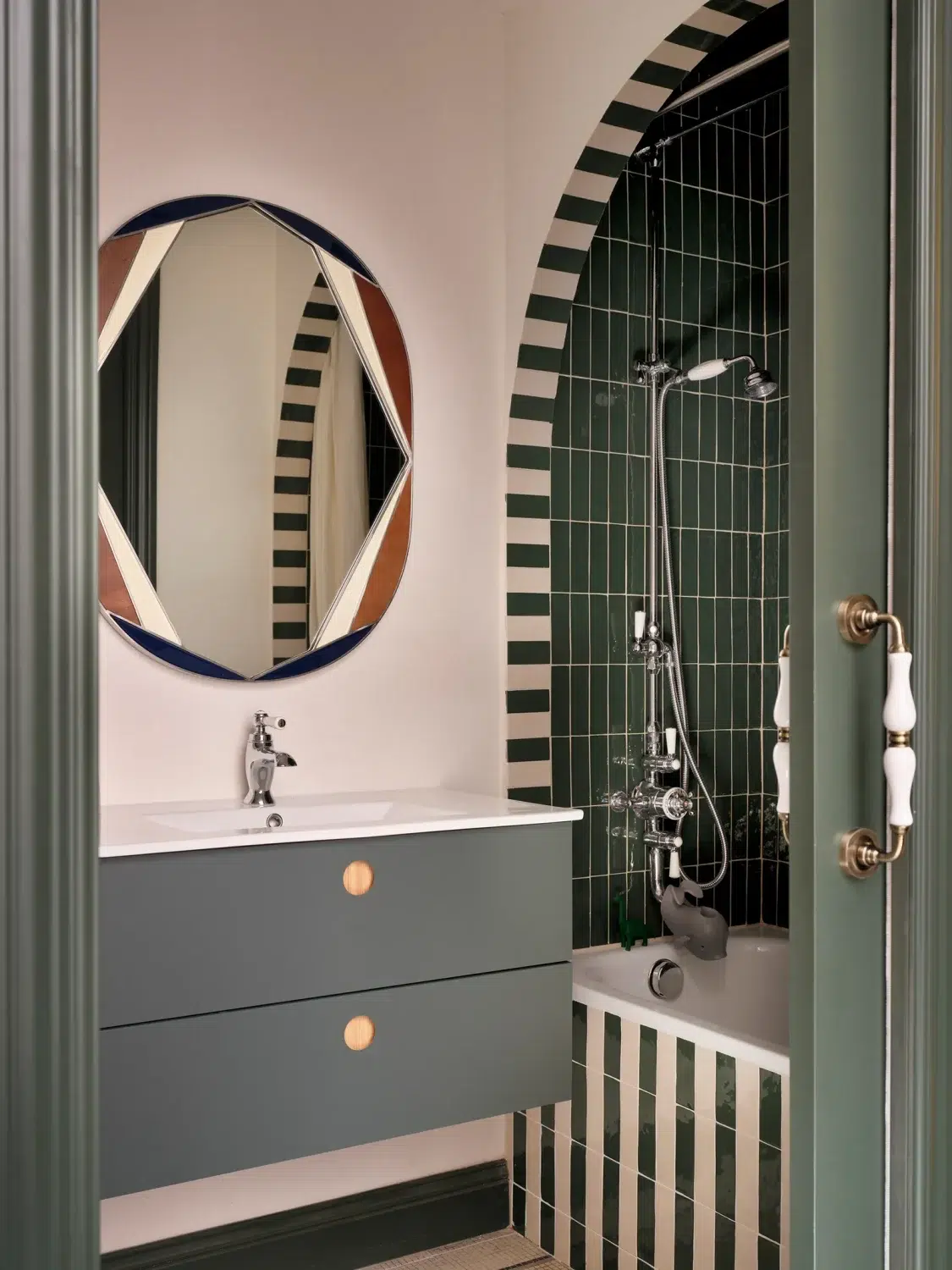 - A bold green bathroom creates a playful moment