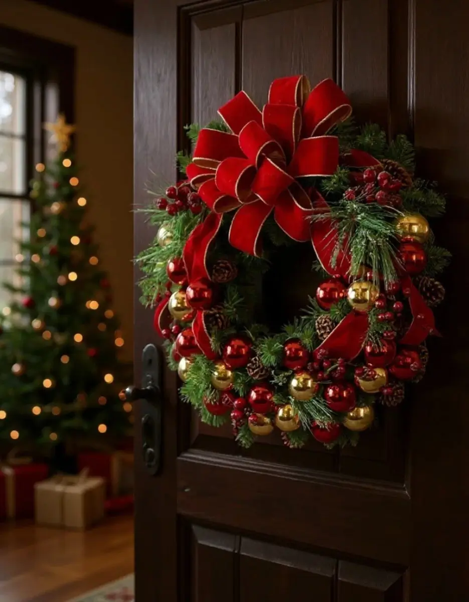 The Ralph Lauren–inspired holiday look is everywhere this year, and this wreath captures that timeless, luxurious feel perfectly. Rich reds, burnished gold ornaments, and natural pine cones come together in a style that feels classic and elevated without being stuffy. Find it here.