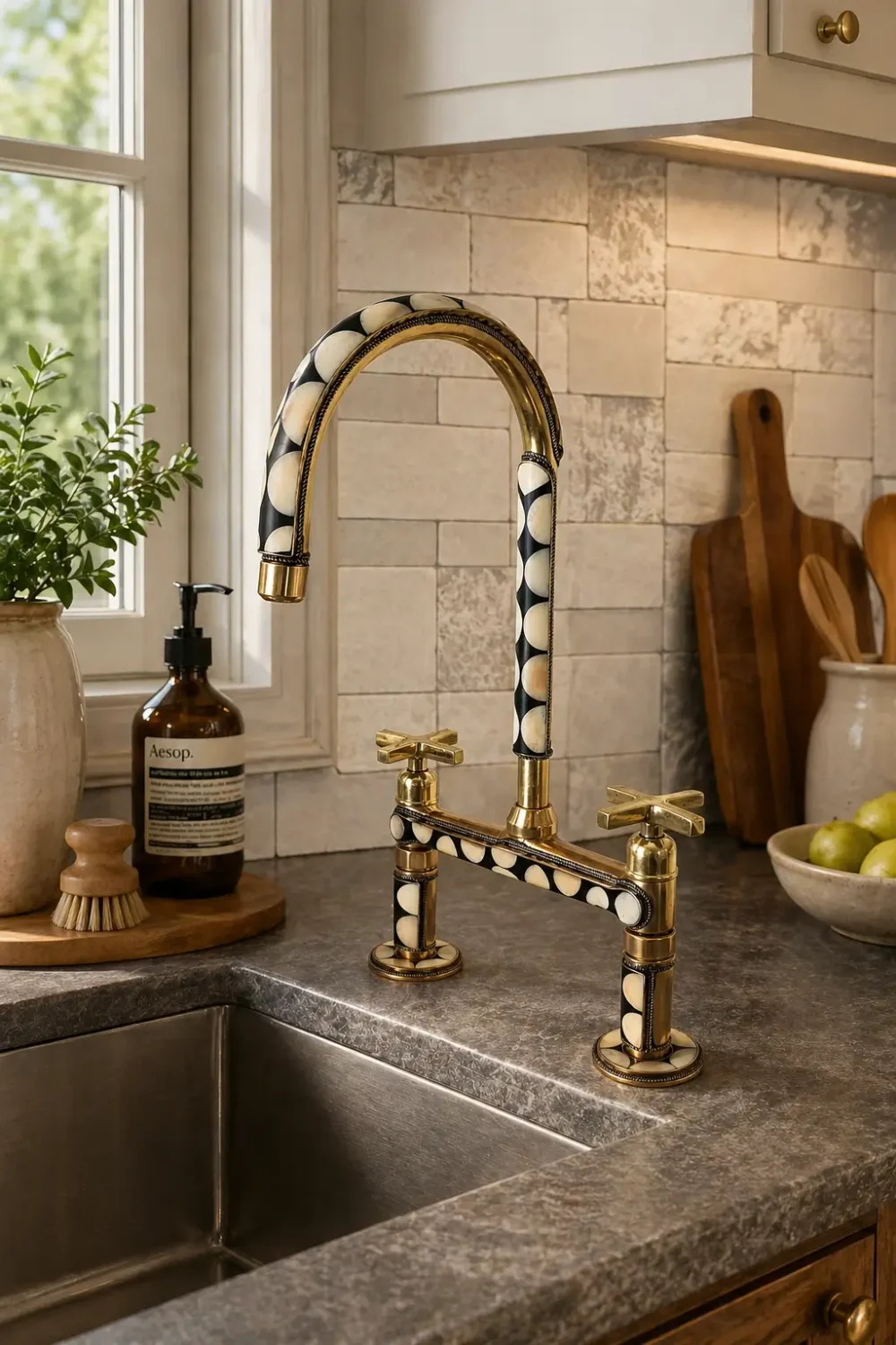 Handcrafted from solid brass and finished with intricate black-and-white resin inlays, this bridge-style faucet blends old-world craftsmanship with bold, almost graphic design. It’s not trying to blend in—and honestly, why should it?