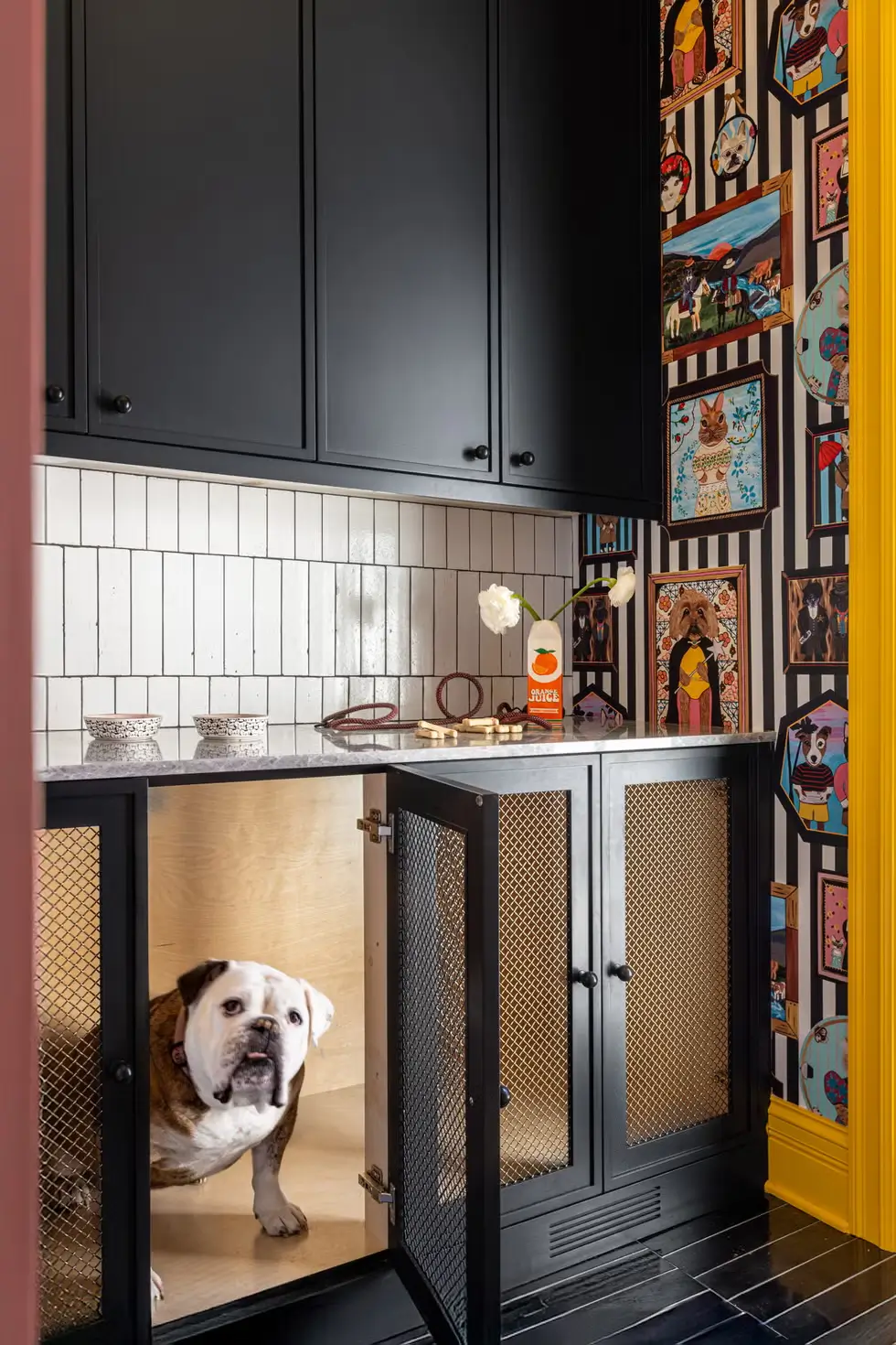 Okay world, this is the pièce de résistance. For a household with four kids, three dogs, and three cats, Milburn declared: “I hate the way regular crates look” — so the dog-zone gets its own fully styled room. Wallpaper by Wallshoppe with whimsical animal-portraits, built-in pet friendly cabinetry (no clunky wire crates in sight).