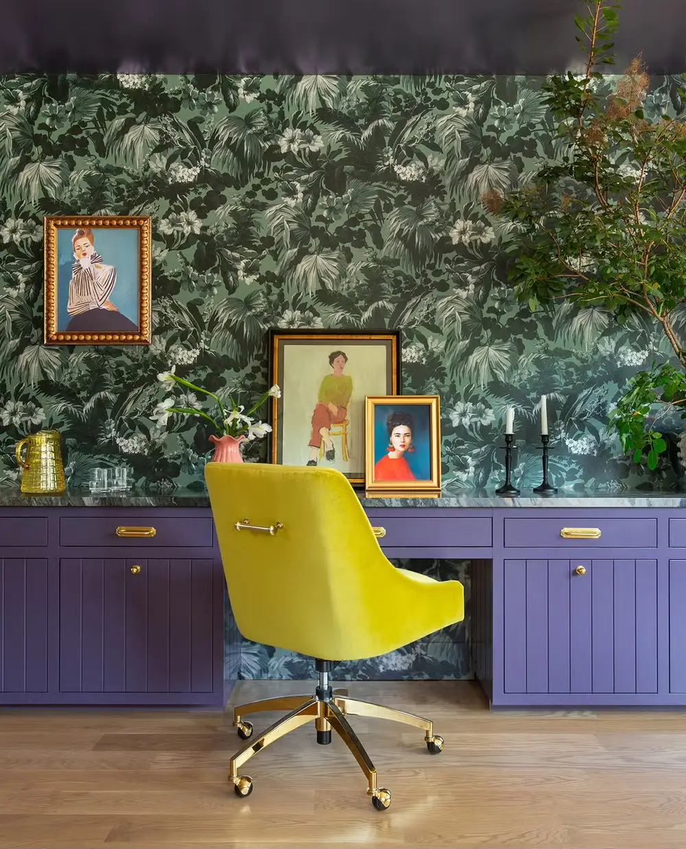 - Laundry? Make it magical: Instead of “ugh chores,” we’re talking cabinets in Autumn Purple, a Razzle Dazzle ceiling and yellow zellige tile. Yes, the mismatched appliance is actually green (surprise!).