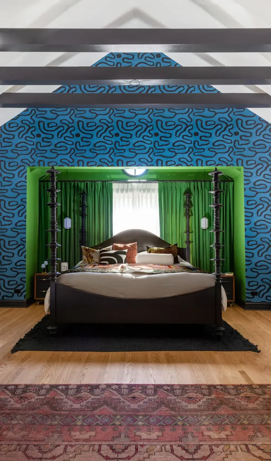 - Primary suite: Neon green drapery niche meets a blue & black lyrical wallpaper. If your idea of “quiet luxury” includes electricity, this is it.